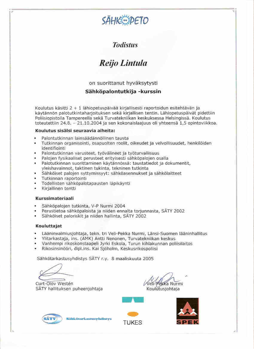 Reijo Lintula on saanut palontutkinnan peruskoulutuksen Kuopion Pelastusopistolla. Erikoisalaa ovat kuitenkin sähköpalot ja niiden syttymissyiden tutkinta. Hän on toiminut jo vuodesta 2003 Sähköpeto ® -projektissa kurssinjohtajakouluttajana (ks. Sähköpeto). Suomessa auktorisoitiin ensimmäiset viralliset, koulutetut sähköpalotutkijat syksyllä 2004. Perustana auktorisoinnille on SÄHKÖPETO ® -kurssien (kaikki kolme tasoa) hyväksytty suorittaminen tentteineen ja palontutkintanäyttöineen (1,5 ov). Tuoreimmat lisäkoulutukset ovat Palontutkinnan intensiivipäivät Revingessä Ruotsissa ja paikkatutkintaharjoitukset Turussa keväällä 2022 ja syksyllä 2023. Sähkötarkastusyhdistys SÄTY ry on uusinut sähköpalotutkijan auktorisoinnin vuonna 2023.